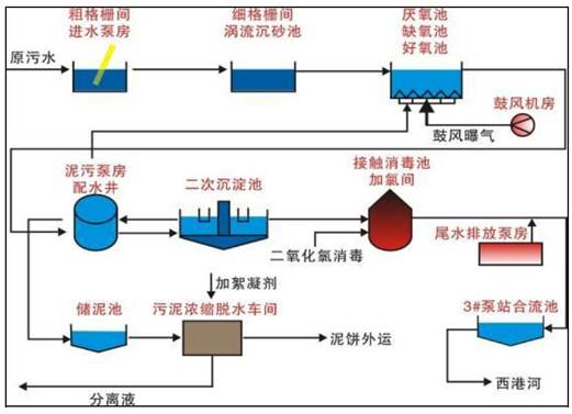主要生產(chǎn)設(shè)備:粗格柵、進(jìn)水泵房、細(xì)格柵、沉砂池、生化池、鼓風(fēng)機(jī)、脫水機(jī)房、二氧化氯消毒池、尾水泵站、廠外泵站